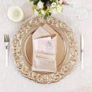 Give your table setting a regal and sophisticated finish with this champagne decorative charger plate, designed with an intricately sculpted baroque-style border and a softly textured center. The raised scrollwork frame adds rich dimension and antique-inspired elegance, making it a striking choice for weddings, banquets, holiday dinners, and formal celebrations.